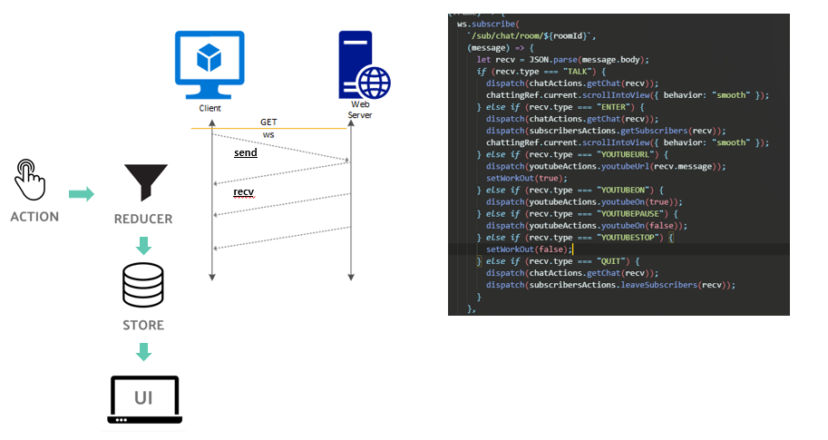 프론트엔드에서는 실시간 유튜브 영상 컨트롤과 채팅 기능을 구현하기 위해 소켓통신과 redux 를 이용했습니다. 사용자의 유튜브 상태를 감지한 후, 변화 시 센드로 상태 메시지를 보내고, 이를 모든 구독자들에게 전달했습니다. 전달 받은 메시지는 타입을 갖고 있으며, 타입에 따라 리덕스를 이용해 모든 구독자의 유튜브 상태를 변화시켰습니다.