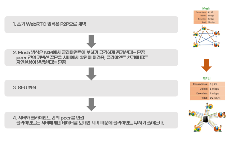 저희는 WebRTC 서비스를 구현하는데, SFU 방식을 채택했습니다. 그 이유는 처음에는 P2P 방식으로 구현했으나 다대다 통신에서 클라이언트에 부하가 급격하게 오기 때문이었습니다. 또한, P2P Mesh 방식을 사용할 경우, peer 간의 커넥션 절단 시 서버에서 확인하기 어려우며, 클라이언트 환경에 따른 지연 현상이 발생하기 때문에 SFU 방식을 채택하였으며, 이를 극복했습니다.