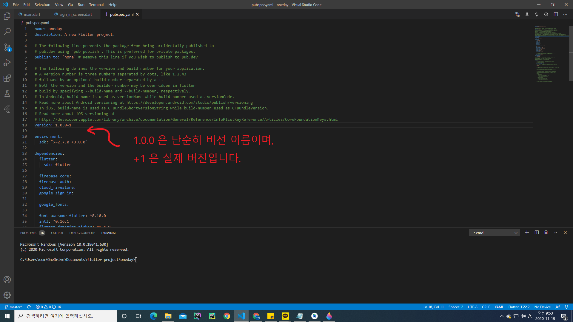 pubspec.yaml 파일 상단을 보면 version이 있는데,