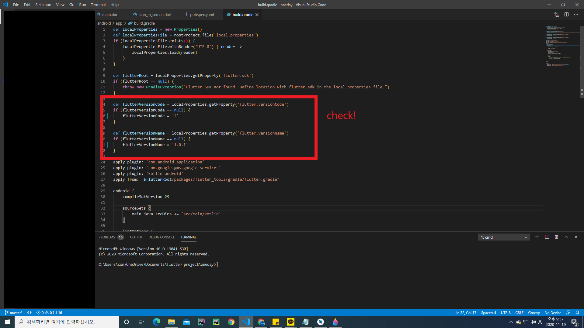 app/build.gradle 파일을 확인하면 플러터 버전 네임과 코드가 있는데,