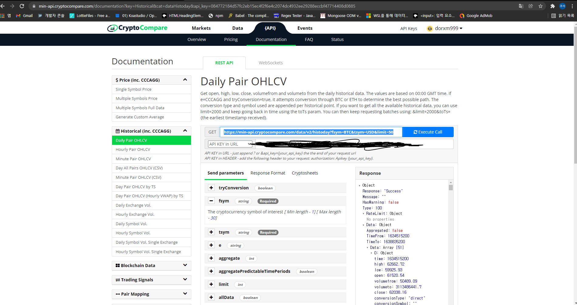 여기서 재밌는 사실은 CryptoCompare 에서 API 를 가져올 때, API Key를 필요로 하지 않고 url 로만 호출이 가능하다는 것이다. (보통은 api-key가 필요한데 말이다.)